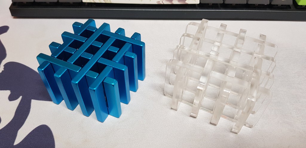 으이? 도대체 Lattice는 뭐고 -2가 붙은 것은 무엇인고 하면, 사실 Lattice는 두 개의 버전이 있습니다. 초기에 제리 루가 만든 Lattice는 제일 첫 조각을 빼내는 데에 5번의 움직임이 필요했지만, 조각의 생김새를 약간 바꿔 6번의 움직임이 필요하게 만든 Lattice-2를 만들어냈습니다. 퍼즐마스터에서 출시한 Lattice의 조각을 보니 Lattice-2입니다. 근데 1번째 버전은 고려할 필요가 없다고 판단했는지 그냥 Lattice라는 이름으로 출시했습니다.