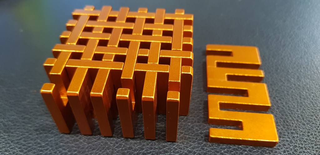 먼저, Dirty dozen입니다. 싱가폴의 제리 루(Jerry Loo Kah Keong)가 디자인한 퍼즐로, 12개의 조각이 격자 모양으로 얽혀있는 맞물림퍼즐입니다. 원래는 그의 개인 숍에서 주문제작을 받고, 그가 직접 알루미늄 주물을 하여 만들었는데, 재료가 소진된 것인지 지금은 주문을 받지 않고 있습니다. 알루미늄 버전 Dirty dozen은 제 블로그의 대문 사진으로 쓰이고 있지요.
