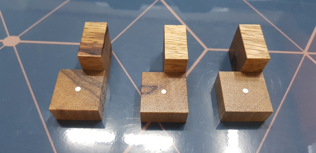 제가 가지고 있는 Three Cubes입니다. 각 조각은 블랙 림바 나무로 만들어졌고, 가운데에 자석이 박혀있는 1*2*2조각이 두 개 붙어있는 형태입니다. 명품 수제 퍼즐 장인 에릭 퓰러(Eric Fuller)가 만들어서 그런지 마감이 아주 뛰어납니다요.