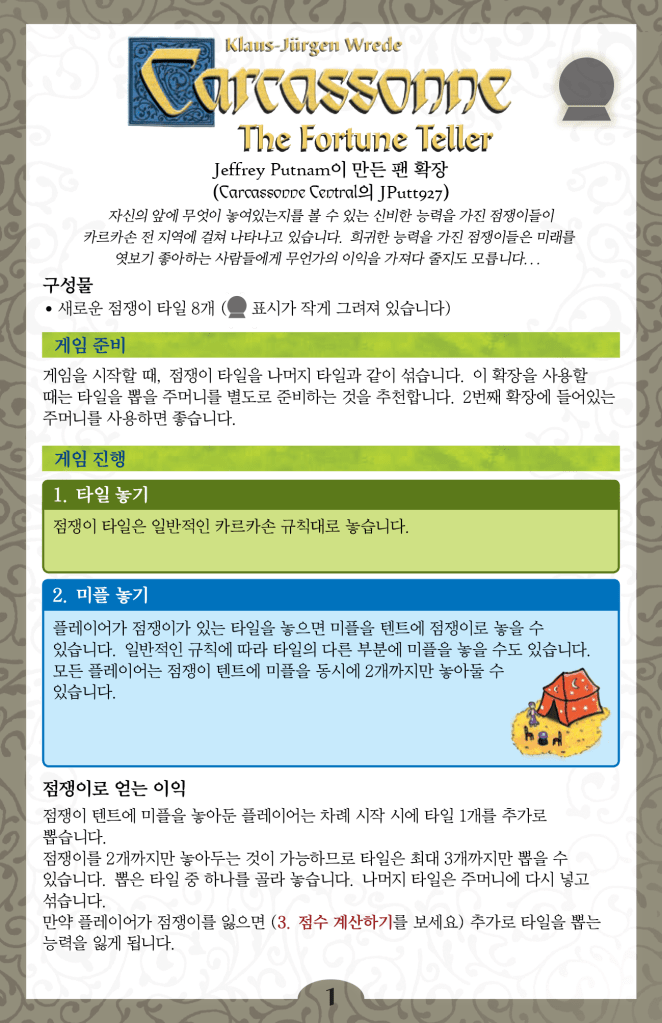 원래는 Carcassonne Central이라는 카르카손 커뮤니티에 올라온 팬 메이드 확장인데, 한스임글뤽에서 마음에 들었는지 공식 PNP 확장으로 인정해 홈페이지에 업로드해놨었습니다.