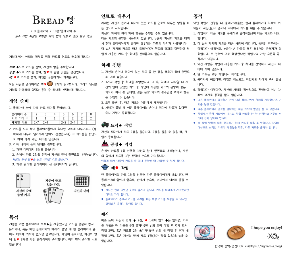 게임의 이름이 정말로 빵(Bread)입니다. 하트 카드를 빵이라고 부르고, 나머지 세 문양의 카드는 각각 빵을 생산하기 위한 시설들입니다.