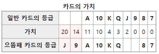 카드 구성: 3-A(48장)를 사용.각 숫자는 A>K>Q>J>…>4>3의 강약을 가진다.