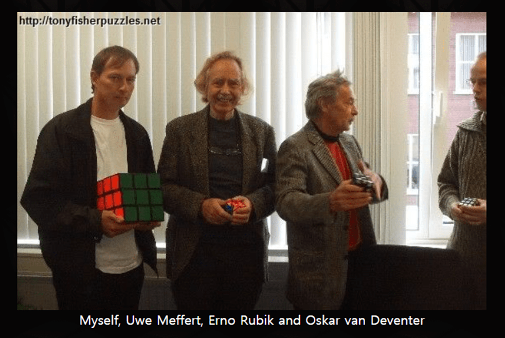 먼저 큐브의 역사를 말할 때에는 이 넷을 빼놓고 말할 수 없습니다. 순서대로 토니 피셔, 우베 메퍼트, 에르뇌 루빅 그리고 오스카 반 디펜터죠.