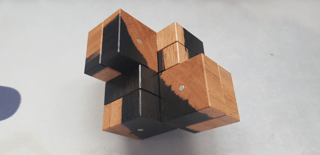 프랭크 폭스는 레일 구조를 이용한 물체를 고안했지만 목적이 퍼즐이 아니라 틱택토를 하는 기구로 사용하고자 했지요. 구조 또한 여러번 돌려 면을 맞추는 용도로 쓰기에는 무리가 있었습니다.