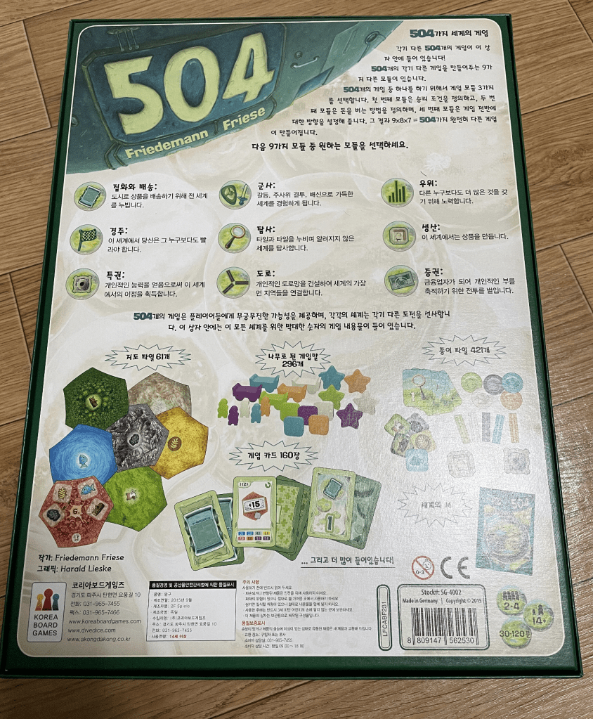 이 게임은 특정 게임 하나가 들어있는 게임이 아닙니다. 9가지의 모듈형 게임 규칙과 그 규칙에서 사용하는 컴포넌트를 제공합니다. 플레이어들은 9가지 모듈 중에서 무작위로 3개를 정합니다. 예를 들어 5, 3, 7을 정했다면 우리는 모듈 5, 3, 7번을 조합해 규칙이 뒤섞인 게임 하나를 창조해서 플레이합니다. 게임의 이름 504는 9개 모듈로 할 수 있는 게임의 가짓수(9*8*7)를 나타냅니다.