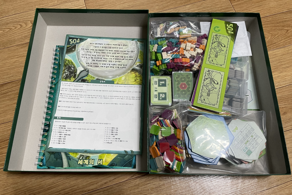 구성물입니다. 뭐가 많습니다. 수많은 토큰과 타일, 카드, 보드, 규칙서, 주사위 등등.. 그리고 세계의 서가 있습니다.