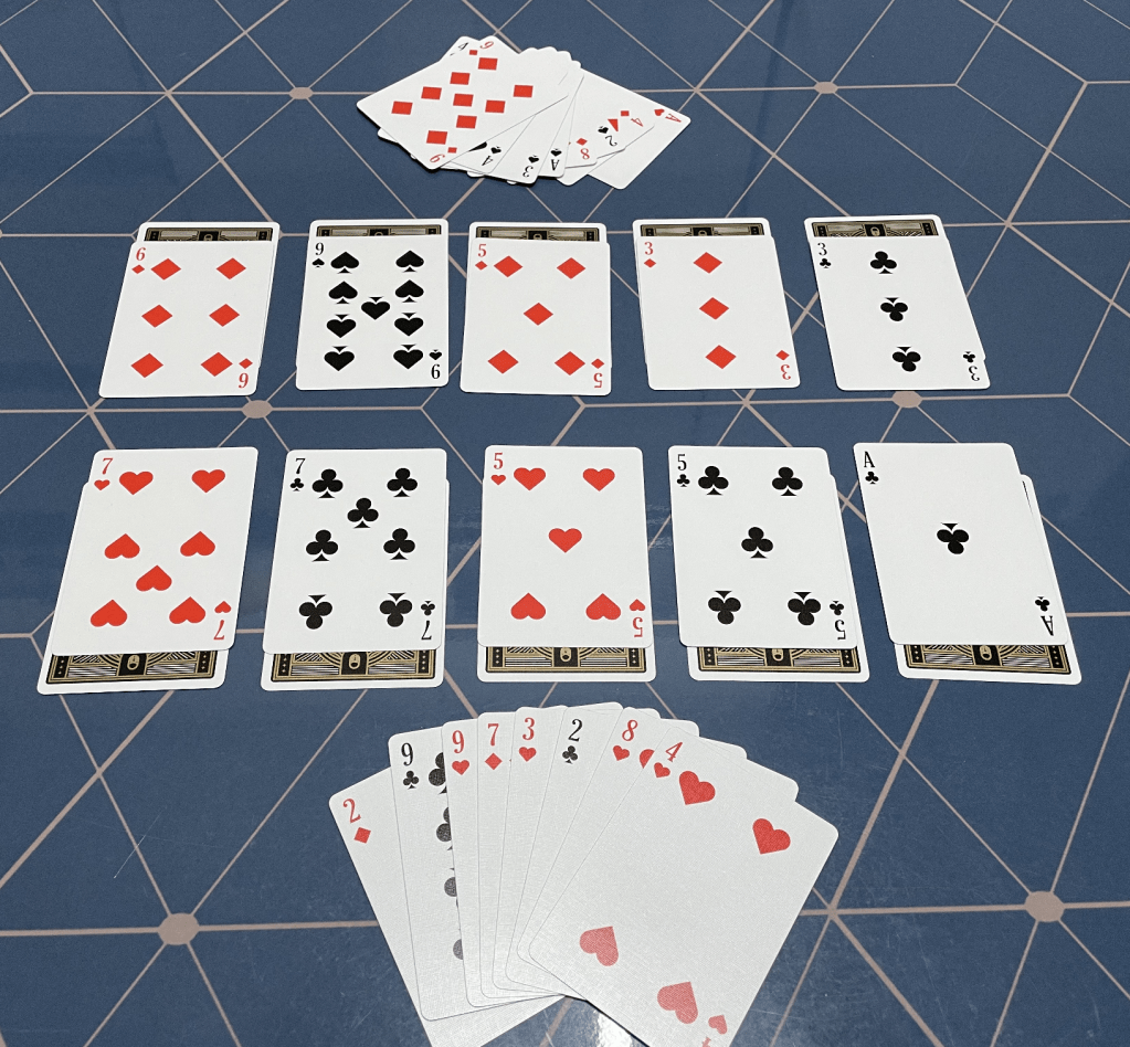 추가로 5장씩 나누어받고, 뒷면 카드 위에 한 장씩 앞면으로 포개놓는다. 2, 3번 단계에 앞에 놓은 카드들을 허수아비라고 부른다.