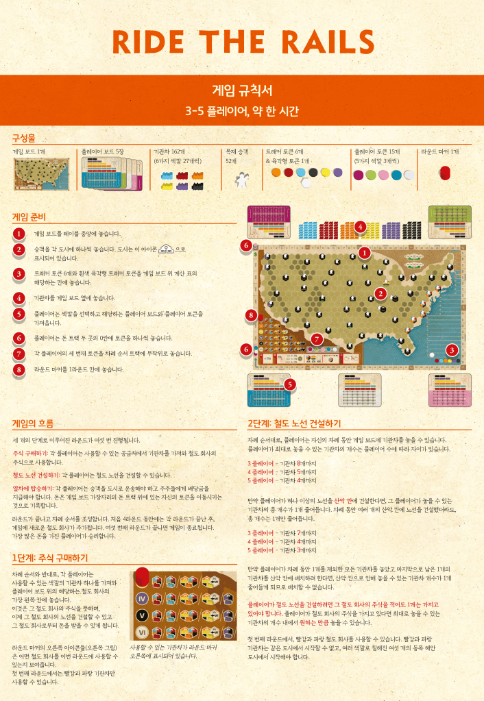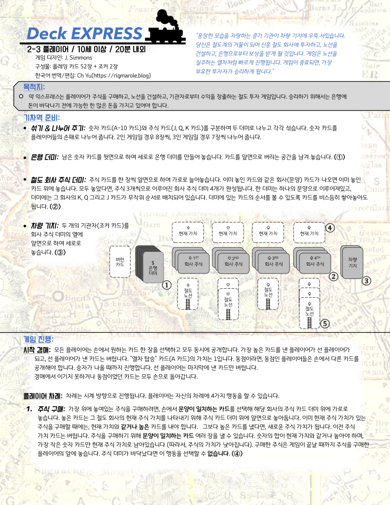 플레잉 카드로 어떻게 철도 게임이냐? 라는 생각이 드는데, 게임 규칙을 자세히 보면 경매, 주식, 철도, 배당금 등 철도 게임의 기본 시스템이 모두 들어있습니다. 시스템이 완성되어 있으니 오묘하게도 실제로 철도 게임을 하는 듯한 느낌이 듭니다. 미니 익스프레스나 아이리시 게이지같은 큐브 레일 시리즈를 해봤으면 더 느껴질 것이라 생각합니다.