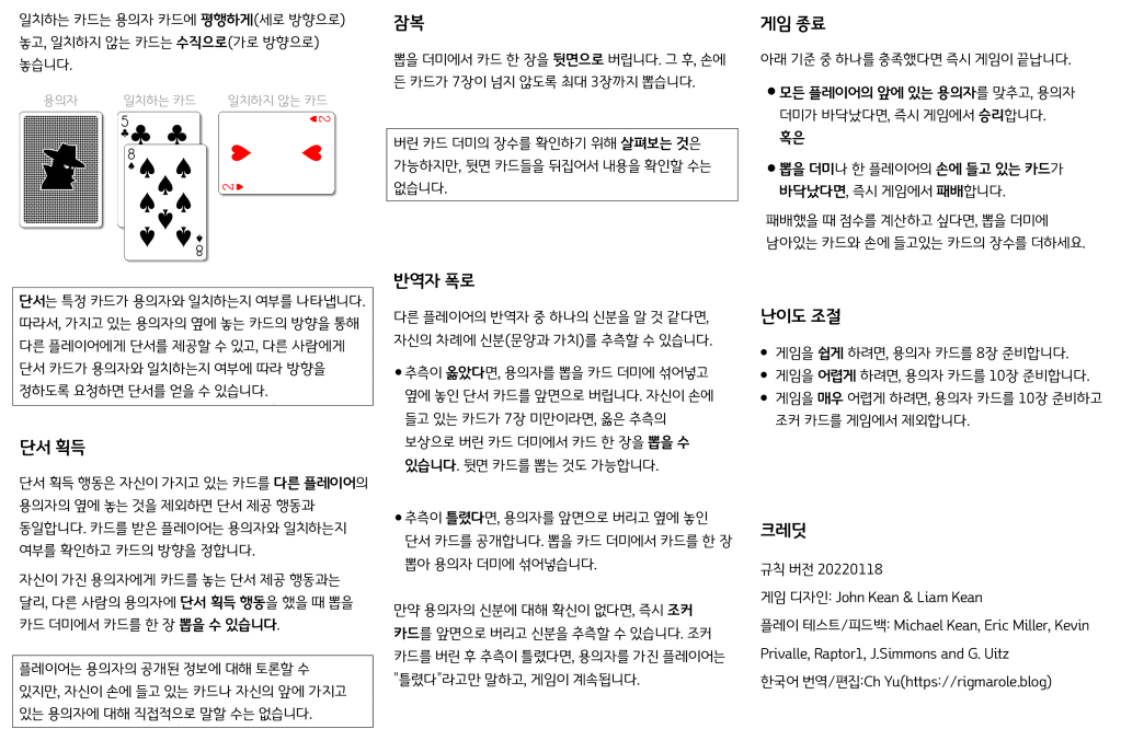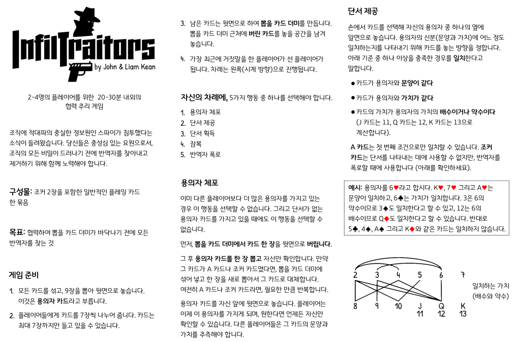 https://www.riffleshuffleandroll.com/vidrasso 비드라소는 2인 클라이밍 게임 ‘해기스’의 작가인 Sean Ross가 디자인한 2인 트릭테이킹 게임입니다. 보통 카드 게임을 2명이 할 때의 가장 큰 문제점은 자신이 가지고 있지 않은 카드는 곧 상대방이 가지고 있다는 뜻이므로, 카드의 행방을 짐작하기가 쉽다는 점입니다. 하지만 비드라소에서는 뒷면으로 놓인 허수아비 카드 5+5=10장, 상대방에게 받은 선물 카드 1장이 있어 카드의 행방을 짐작하기 어렵게 합니다.