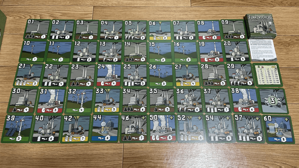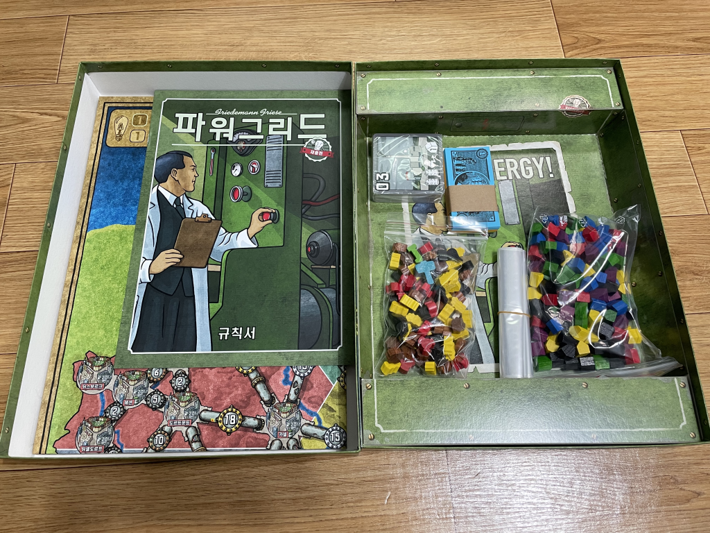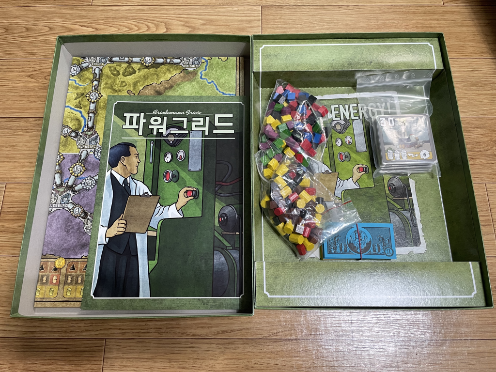 컴포넌트, 종이 돈, 발전소 카드, 규칙서, 지도가 들어있습니다. 지도의 지명은 알파벳으로 쓰여있습니다.