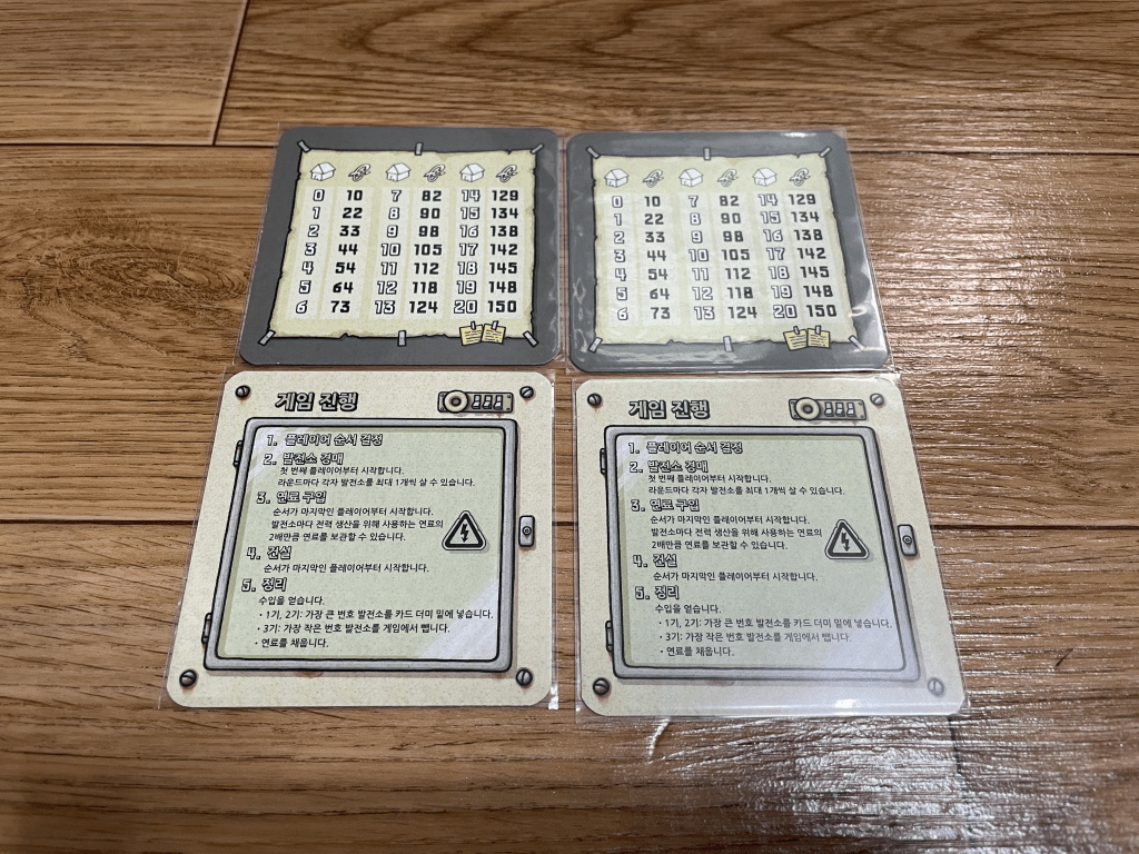 기본판에 들어있는 참조카드입니다. 앞면에는 발전소에 따라 얻을 수 있는 수익이 쓰인 표가 있고, 뒷면에는 게임 진행이 요약되어있습니다.