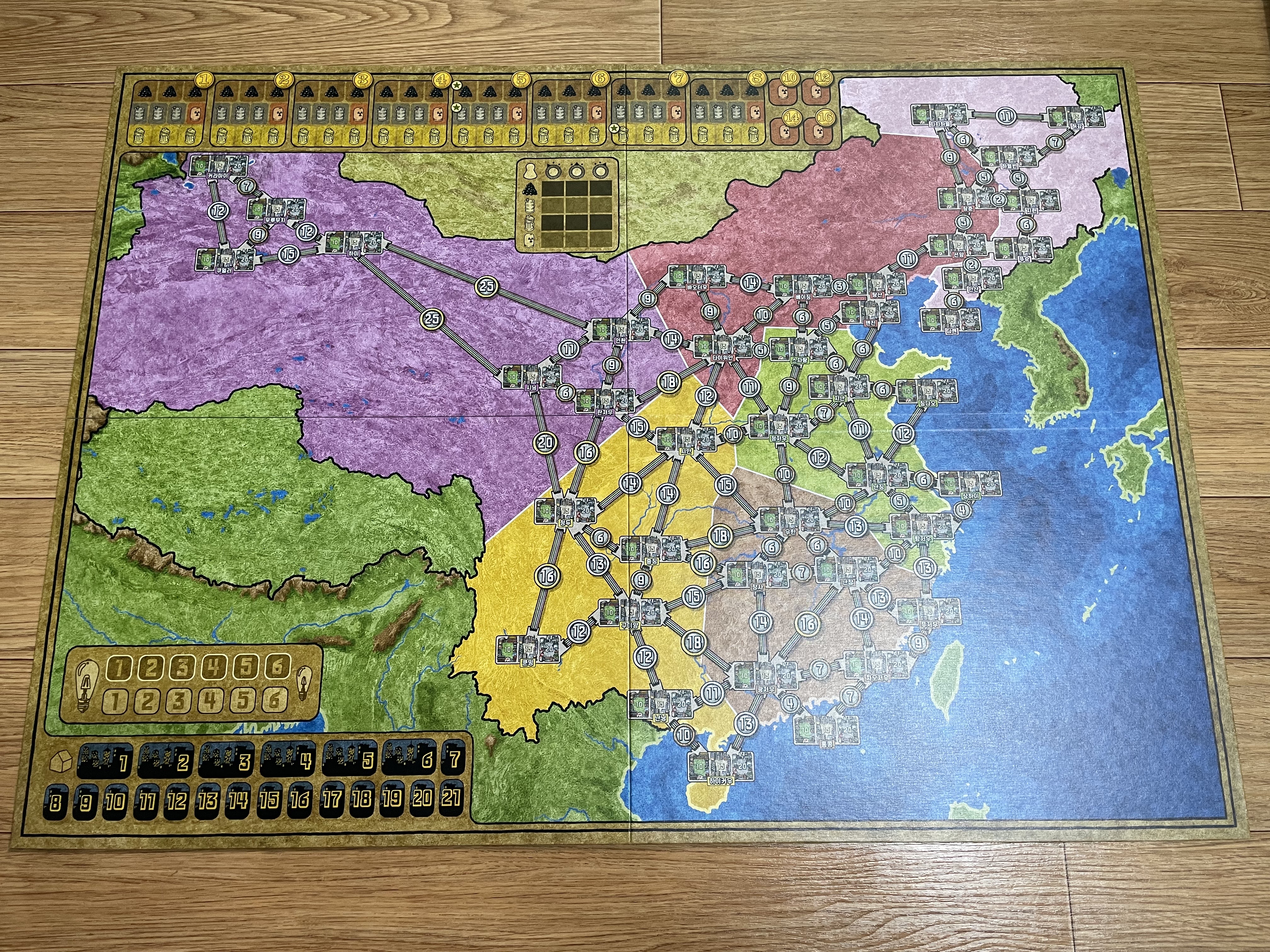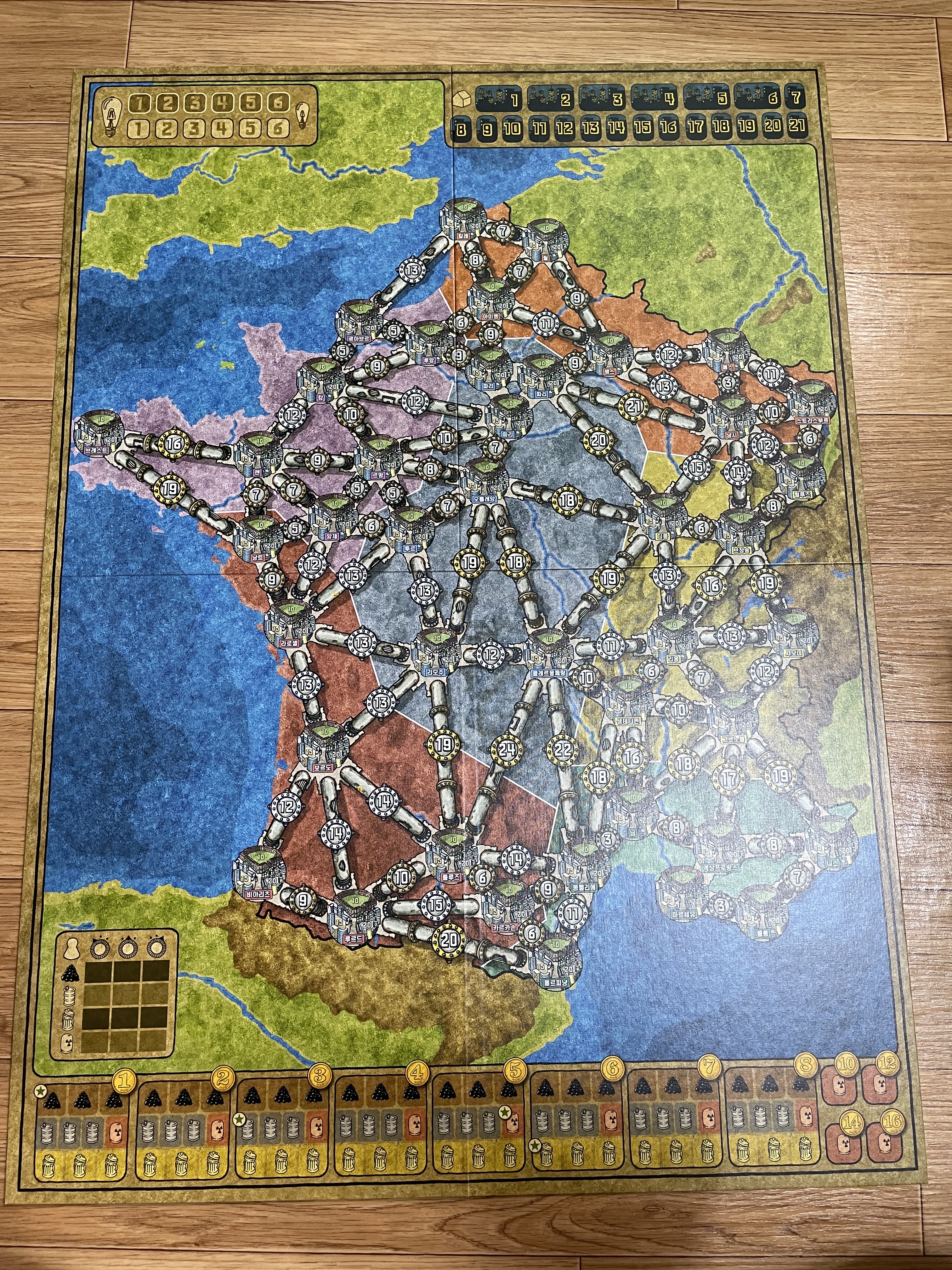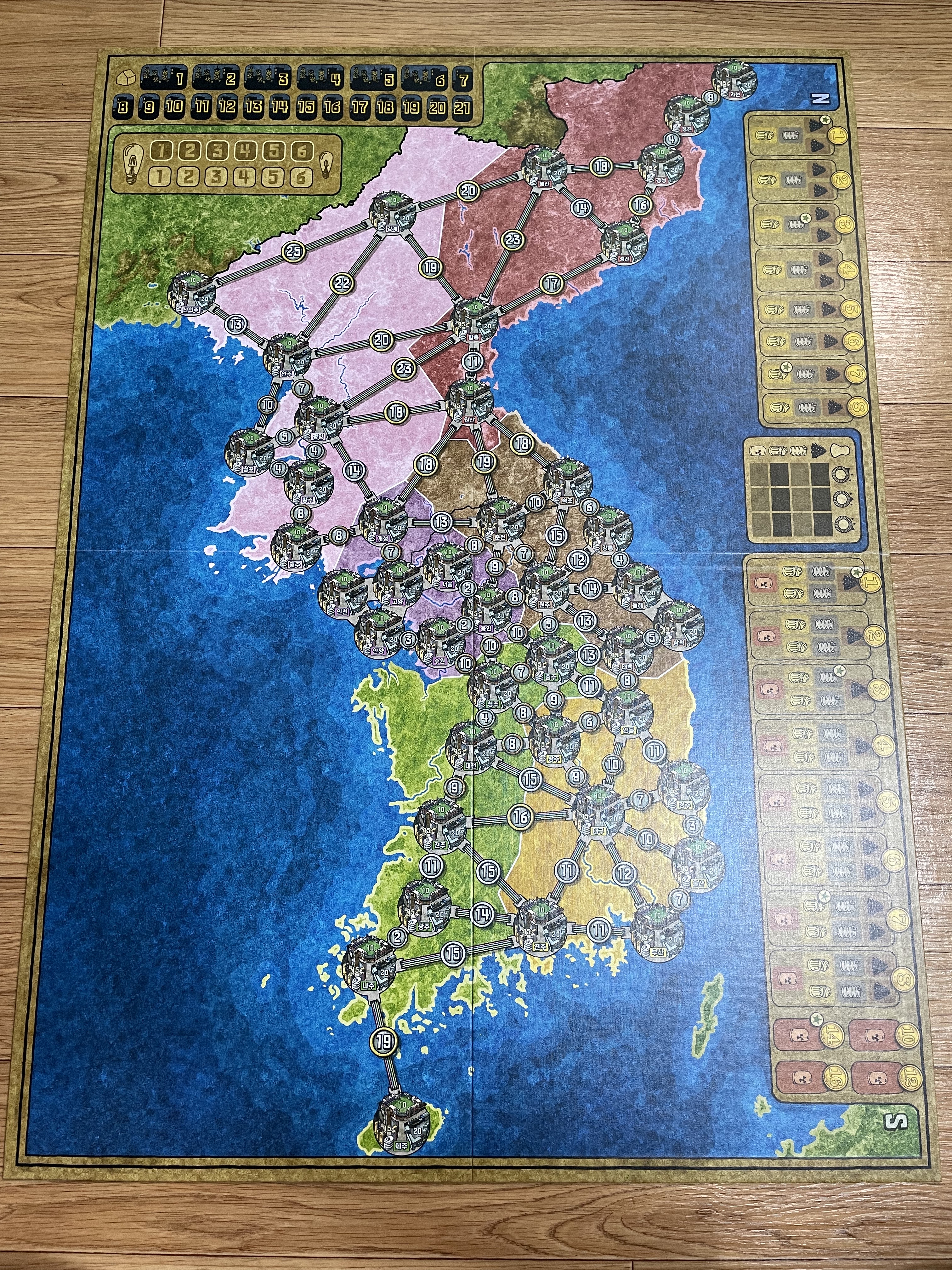 새로 생긴 컴포넌트인 망치 토큰, 1 토큰이 보이네요. 자원 토큰의 생김새도 많이 바뀌었습니다. 지도의 지명이 한글로 쓰인 것도 차이점이네요.