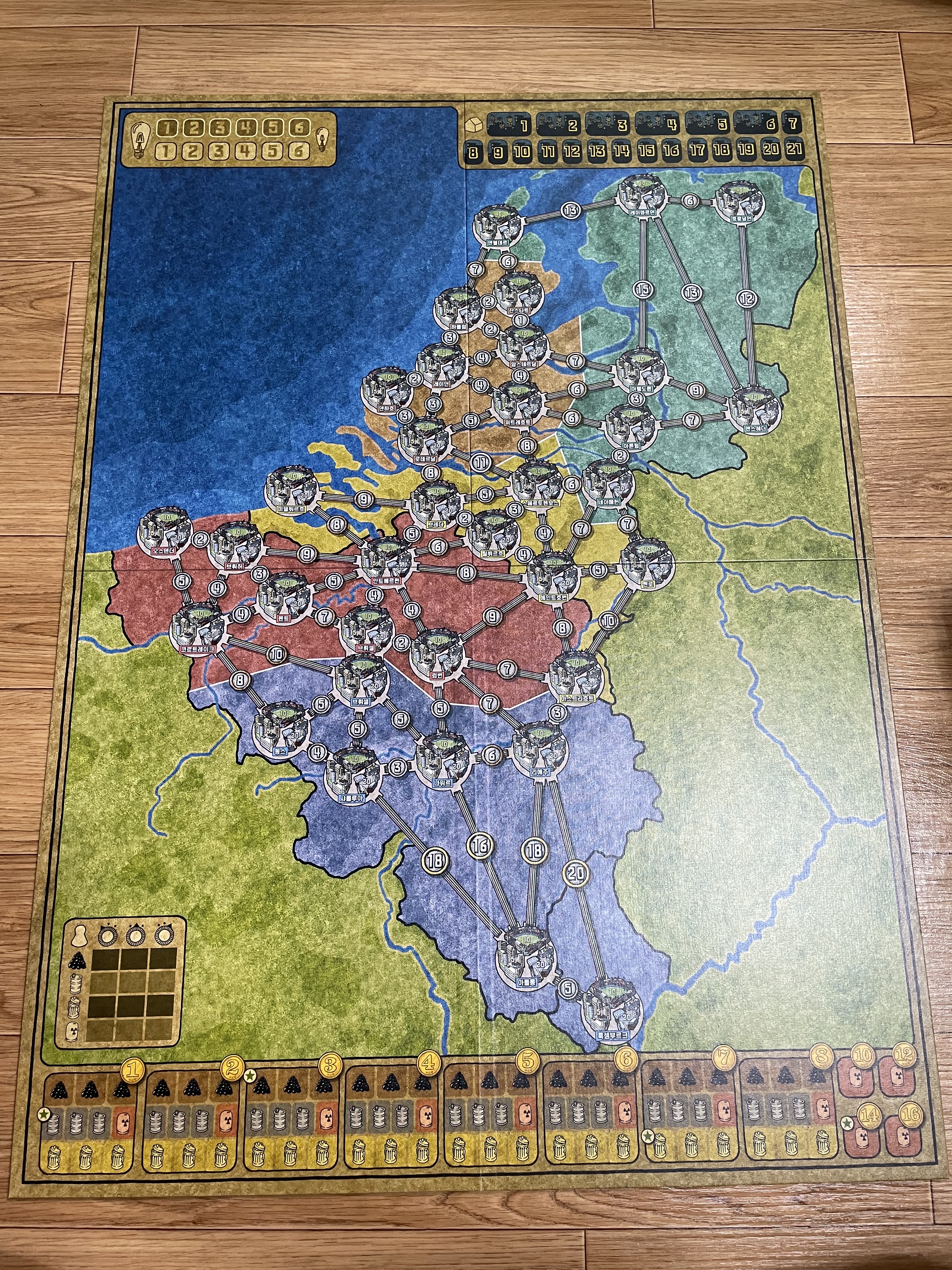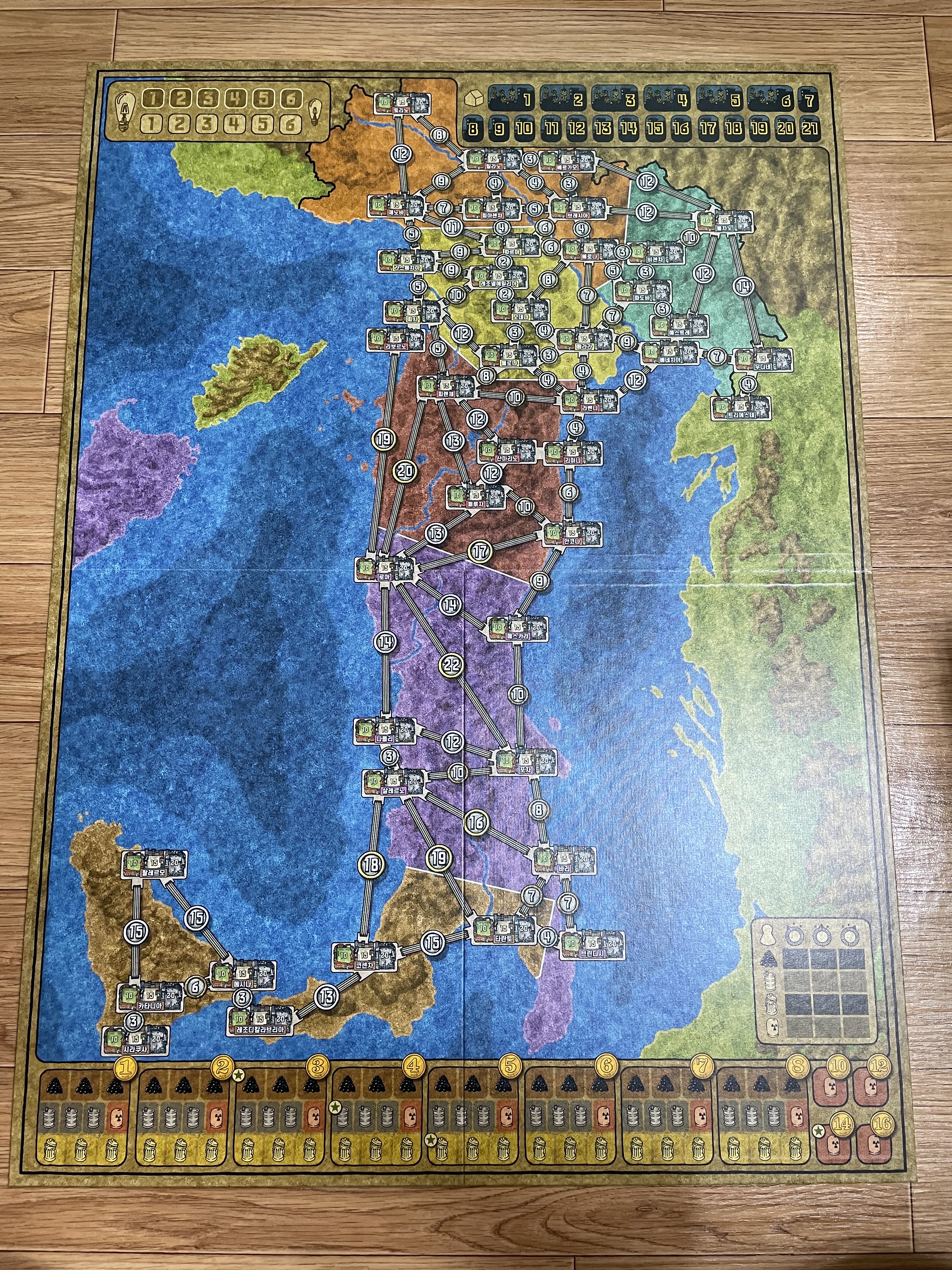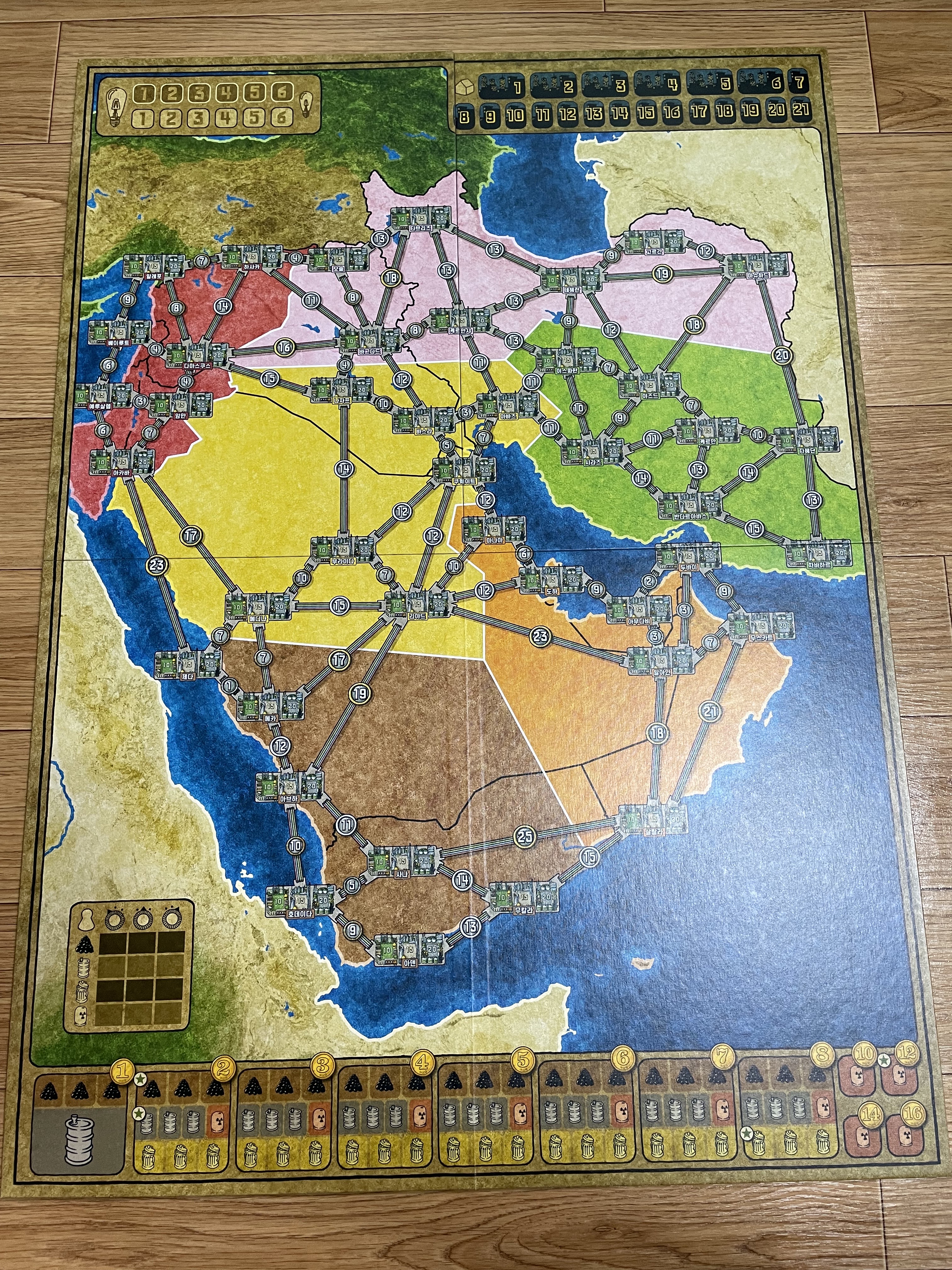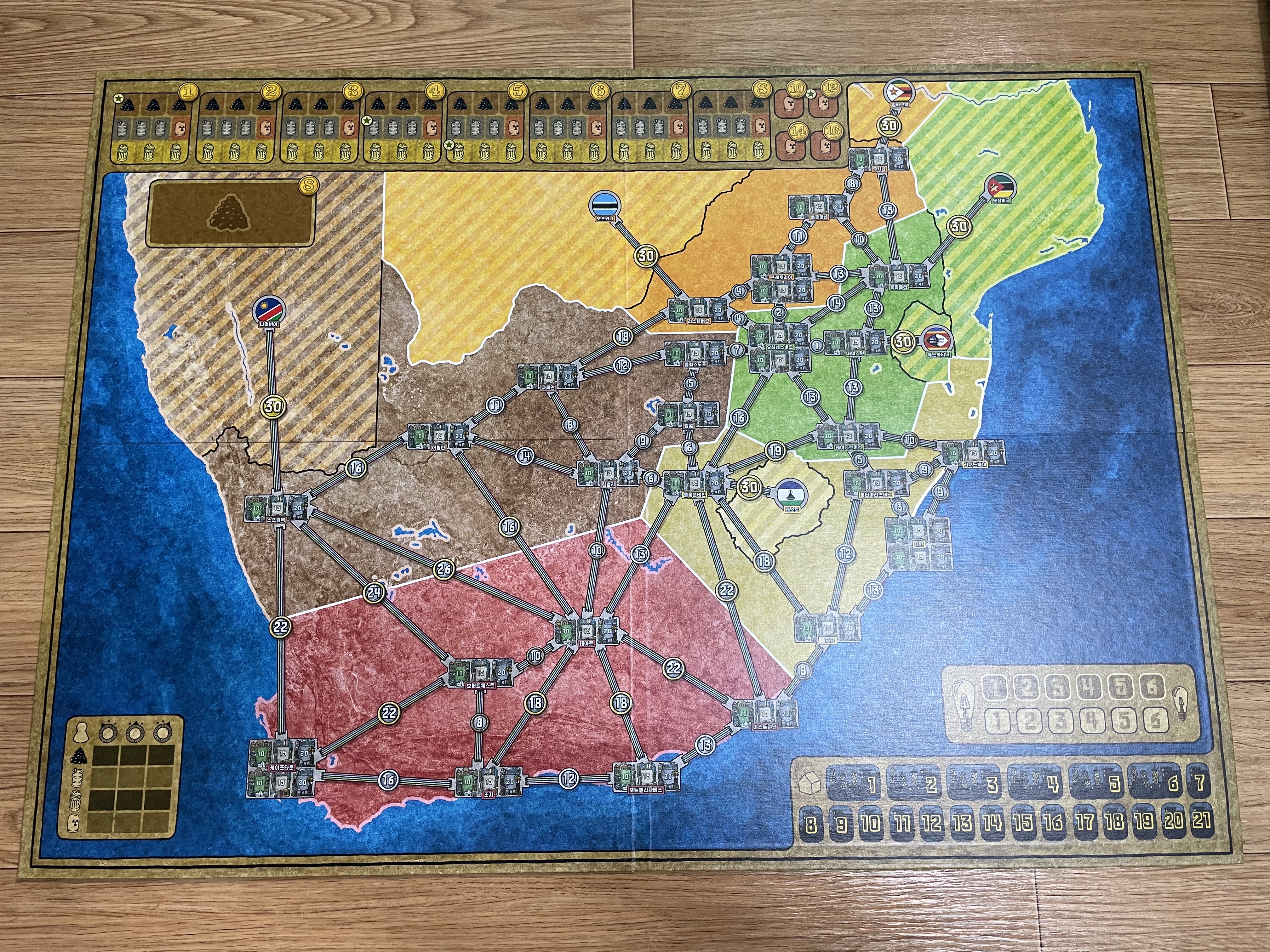 새로 생긴 컴포넌트인 망치 토큰, 1 토큰이 보이네요. 자원 토큰의 생김새도 많이 바뀌었습니다. 지도의 지명이 한글로 쓰인 것도 차이점이네요.