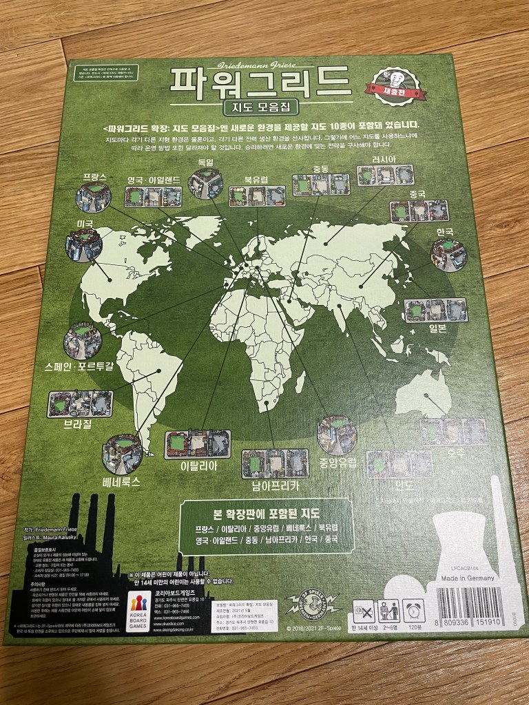 원래 파워그리드는 맵(지도) 확장이 하나씩 별도로 출시되었었습니다. 별도의 박스가 없이 비닐 포장되어있는 지도 확장을 모으다보면 본판 박스에 들어가지 않게 되어서 콜렉터 박스같은게 나오곤 했었습니다. 그런데 이번에 코리아보드게임즈에서 설문을 통해 엄선한 지도 확장 중 일부와 프로모 카드 9종이 포함되어있는 제품이 나왔습니다. 찾아보니 이 지도 모음집이라는 게 한국에만 특별하게 출시된 버전이더라구요.