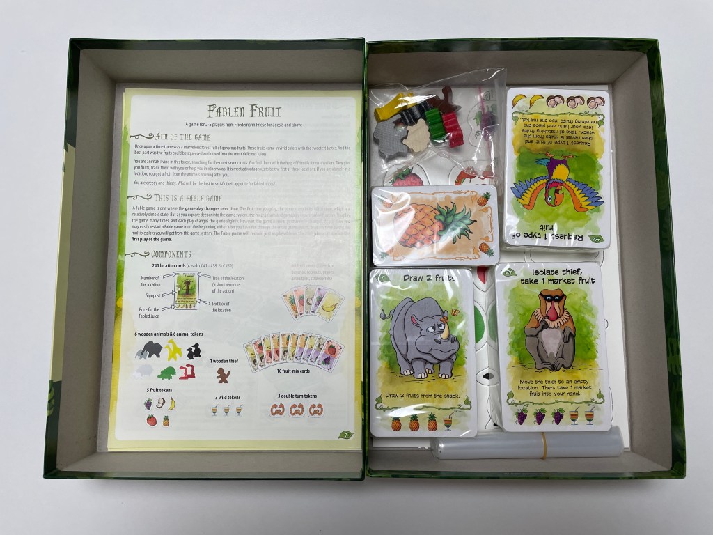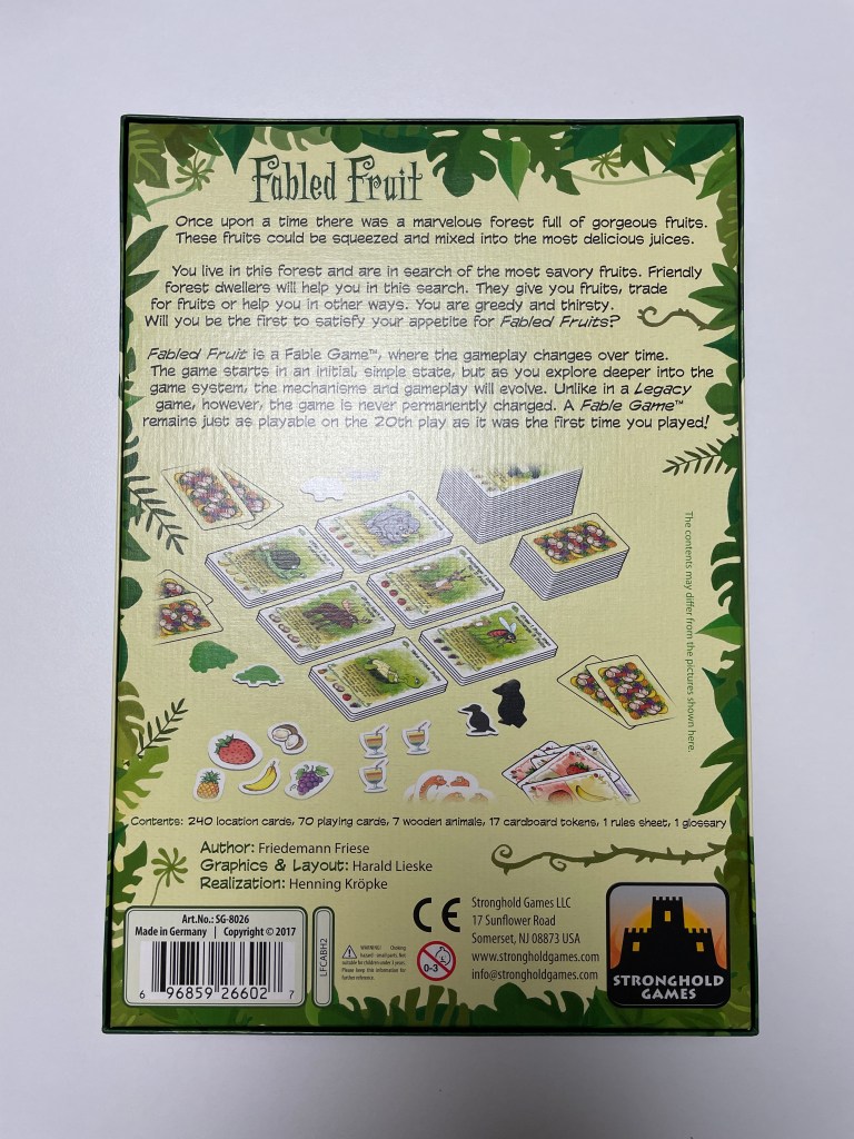 그리고 아래에 보면 Fable Game™이라고 쓰여 있습니다. 이건 프리드만 프리제가 이 게임으로 처음 도입한 시스템인데, 이전 플레이가 이후 플레이에 영향을 끼치는 걸 말합니다. 그렇다고 해서 레거시라는 말은 아니예요. 카드를 훼손하거나 숨겨진 상자를 열거나 그런 건 아니고, 단지 이전 플레이가 어땠는지에 따라 이후 플레이에 새로운 카드 또는 규칙이 추가되는 방식을 말합니다.